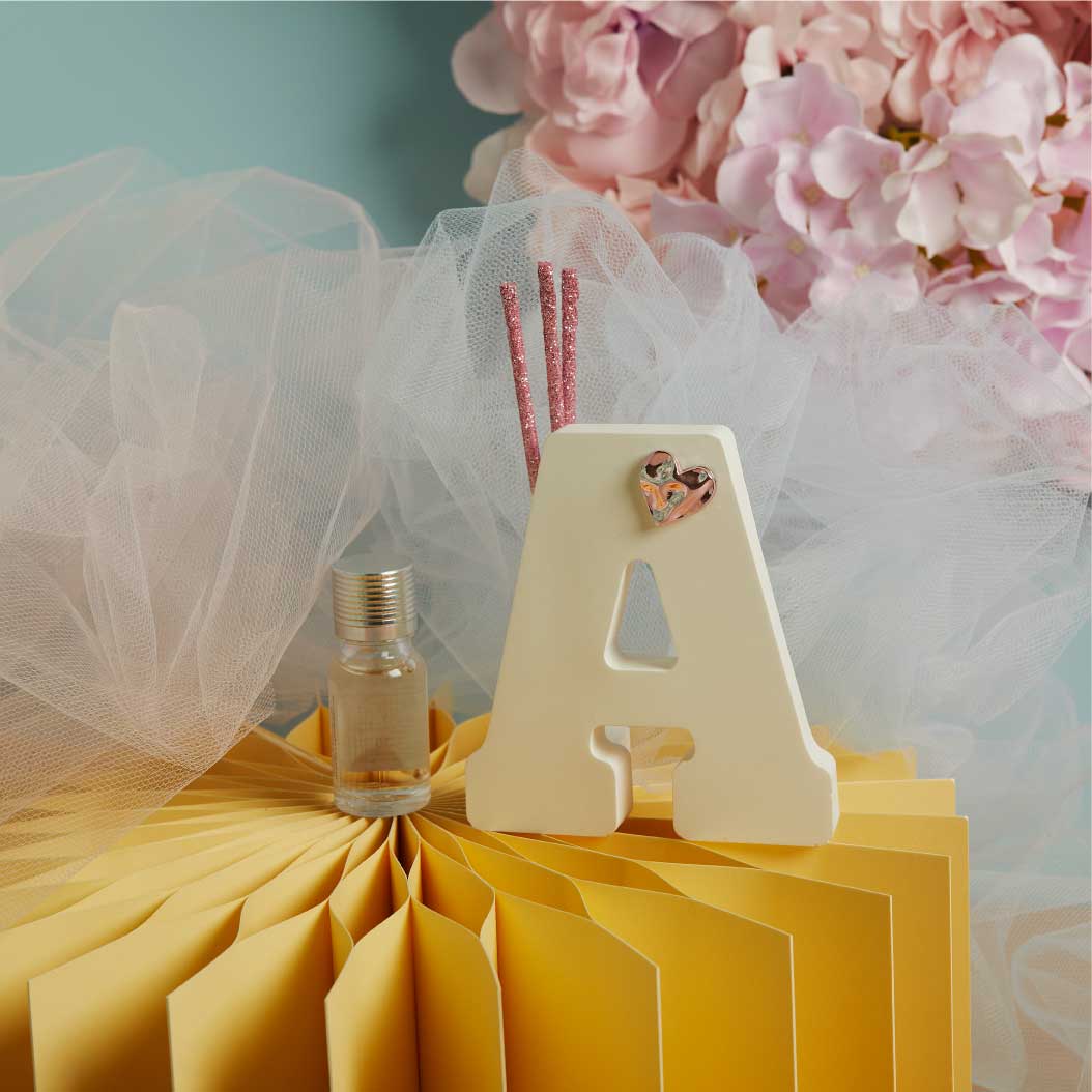 Profumatore con iniziale, comprende bastoncini e profumo, possibilità di scegliere la lettera