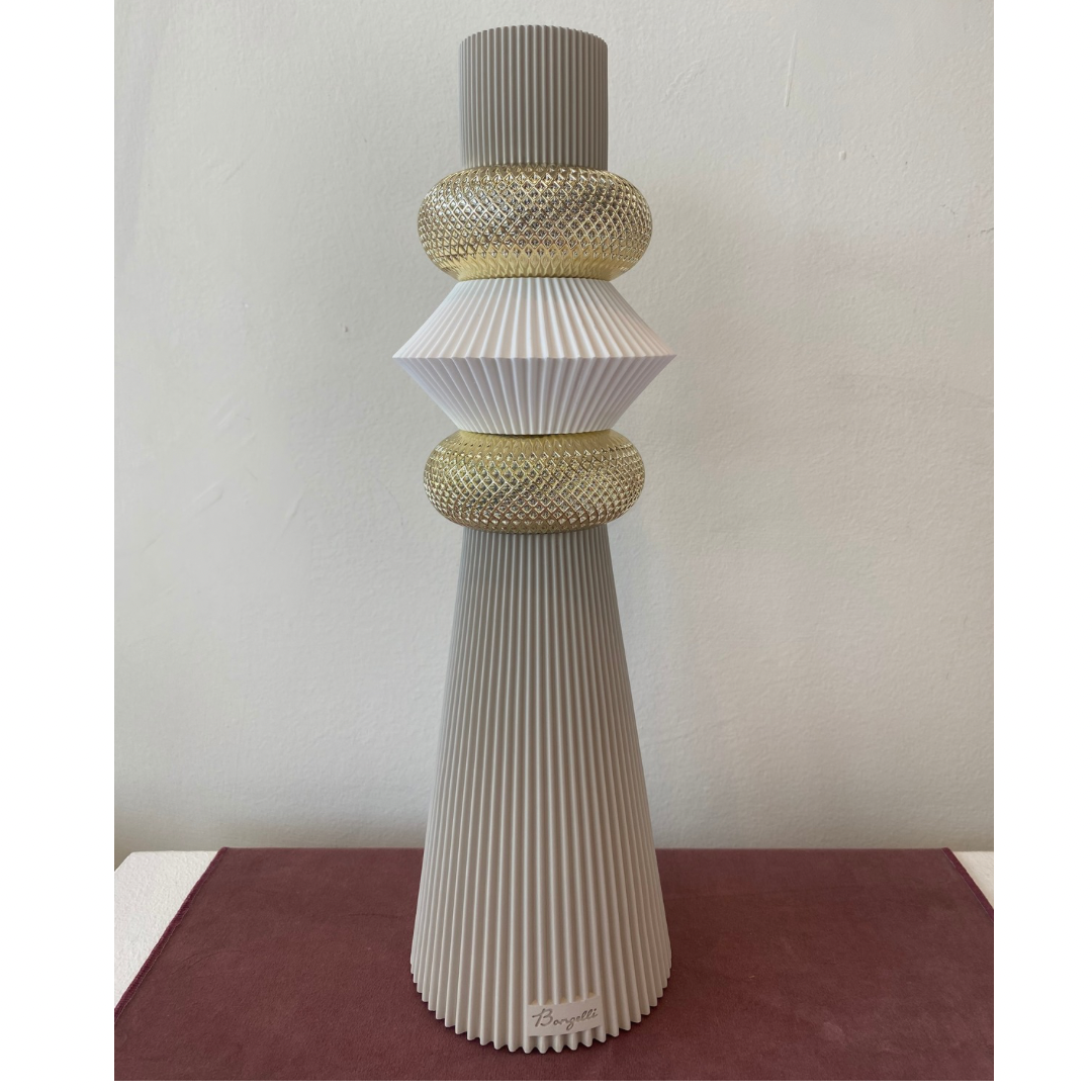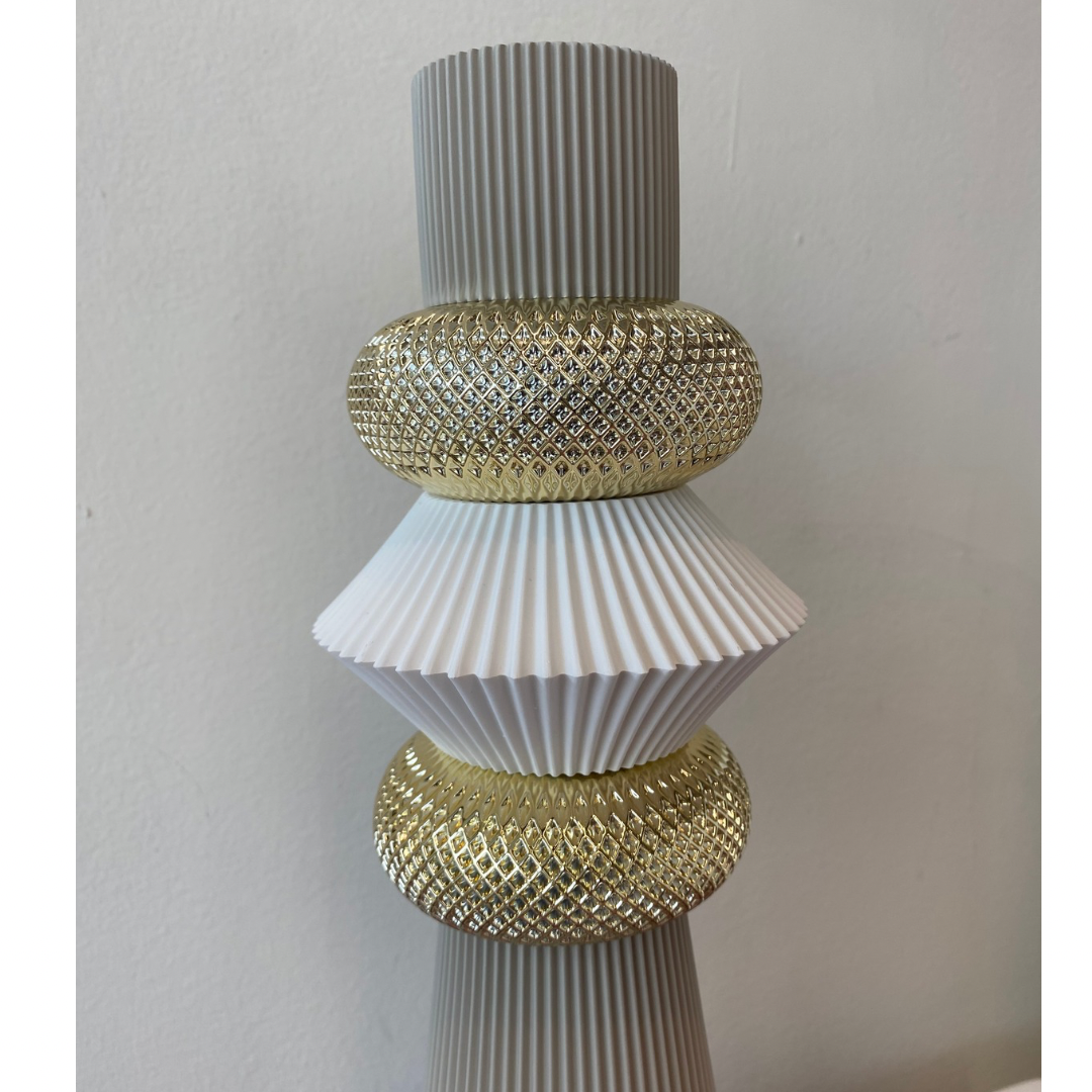 Vaso color tortora con cerchi dorati, in grès, Made in Italy. H.32cm